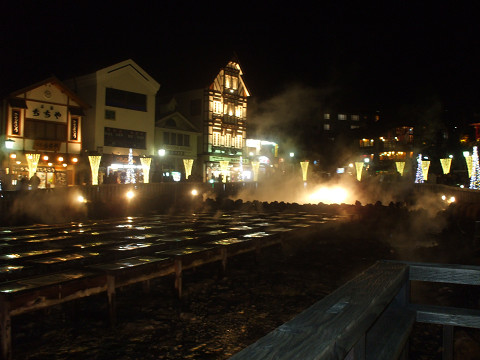 ただで配っている温泉まんじゅうを食べ歩きしながら、付近のお土産屋をのぞき、ライトアップされた湯畑に到着。