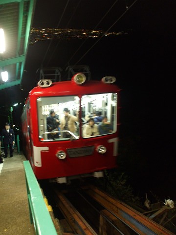 民芸調の大山駒を買い、煎餅をかじりながら駅へ。ここで大人850円のチケットを購入し、最終の阿夫利神社まで登っていく。いつもは17時くらいまでだけど、今日まではイベント期間ということで、ケーブルも20時まで運行するらしい。