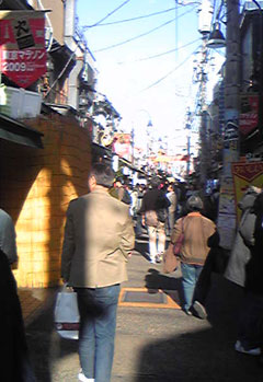 Sの案内で谷中に向かいつつ、途中、10円饅頭に立ち寄る。桜まんじゅうと抹茶まんじゅうと大福を分け合い、熱いお茶を飲みながら和む。こういうときのお茶っておいしいなあ。