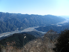 山に囲まれた景色。温泉郷と富士川も見渡せる。