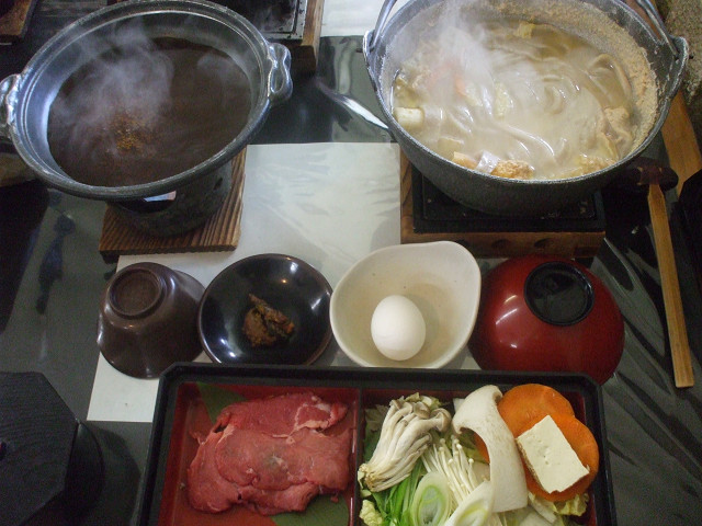 ワインビーフのすき焼きと十穀ほうとう、煮貝の炊き込みごはん。