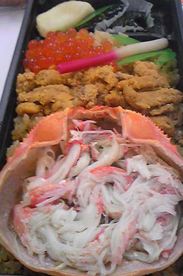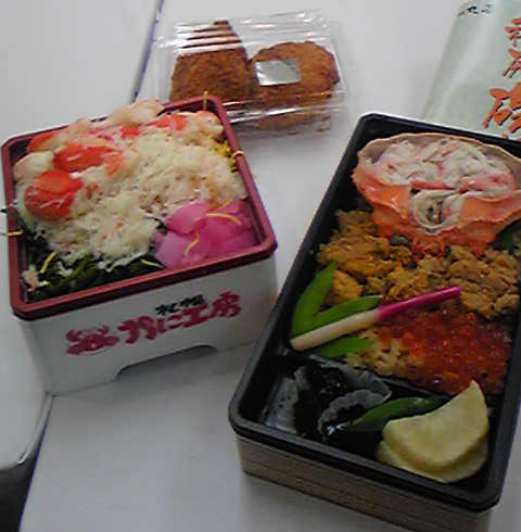 写真左は、夫が選んだかに工房のかにづくし弁当。1680円。たらばがたっぷりでおいしい♪
