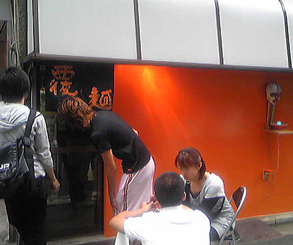 「覆麺」は神保町駅前セブンイレブンを曲がったあたり(神保町2-2)にあり、壁には謎の覆面が飾られている。意味不明なコンセプトのくせに味は適当でないらしく、行列ができていた。