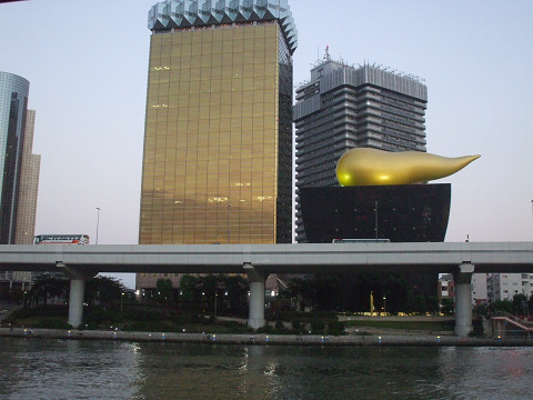 たぶん有名なアサヒビールの金の泡の前から出発。何でも松本零士デザインの新型水上バス「ヒミコ」とかいうのがいるらしいけれども、我々が乗り込んだのは普通のバージョン。カップルがいちゃついているのを横目に、ケンカ直後なので気まずく着席。