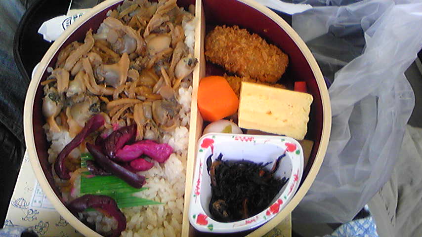 成田線で駅弁「あさり弁当」(1000円)を食べながら移動。5両編成だった。