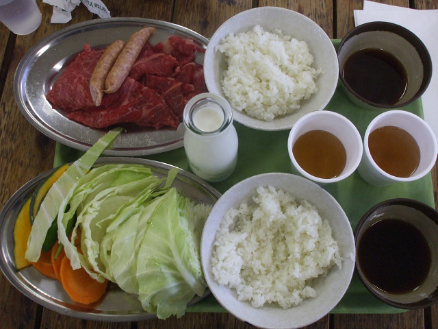 牧場セット2200円、ソーセージセット2500円、搾りたて牛乳150円を注文。これで肉150gずつと野菜とスープとごはんがついてくる。