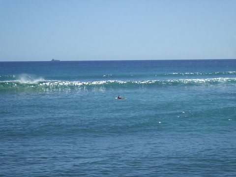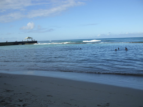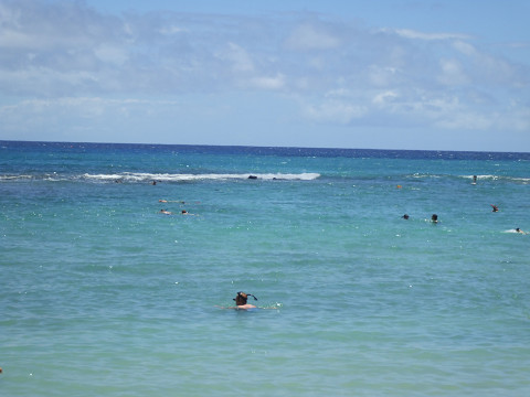 奇跡的なことに朝5時に起床。朝日が昇る7時頃、水着に着替えて近くのクヒオビーチ(ワイキキビーチの外れ)に向かう。着替えるとことかないので、水着の上にABCマート(ハワイのそこらじゅうにあるマーケット)で買った$20弱のワンピースで便利仕様。ちなみにうちは持ってきたけどビーチシートその他も売ってました。