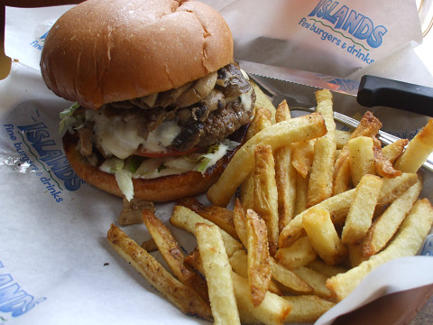 お昼はアイランドバーガーへ。ハンバーガーの老舗らしい。写真はフラバーガー。これにレモネードをつけて$16くらい。