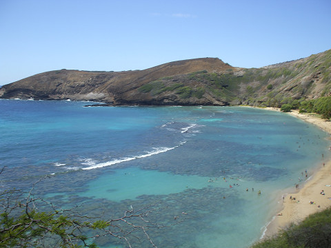 ホテルで着替えて22番のバスで眺望が美しくシュノーケリングで人気のハナウマ湾へ。