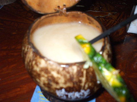 最後の夜なのでさらに近くのリゾートクエスト ワイキキ ビーチ ホテル2階のTiki's Grill & Barまで繰り出し、ずっと食べたかったアヒポキ(値段忘れました)をつまみながら、ココヤシをくりぬいた名物の容器に入ったバナナダイキリ($12)を賞味。おいしい。海を見ながらの生ライブは素晴らしく、バナナダイキリはかなり強くてたぷたぷ入っていたので、だんだん酔いがまわってクラクラしてきた。